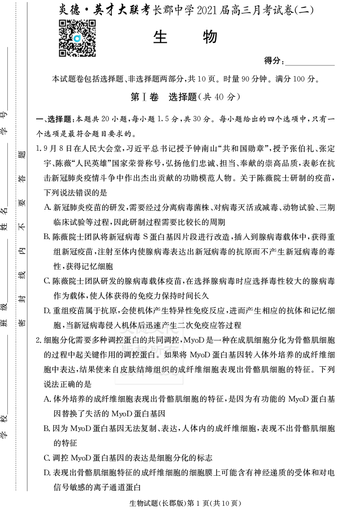 2026長郡中學新高考考前小題沖刺訓練·生物