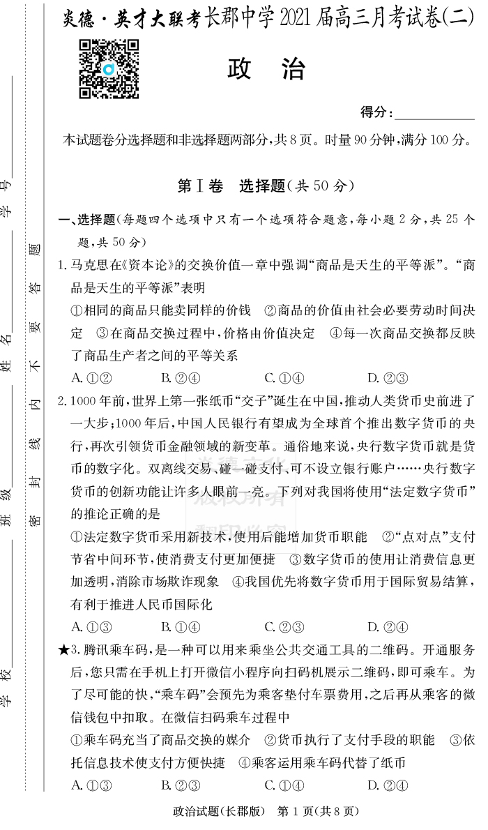 2026長郡中學新高考考前小題沖刺訓練·政治