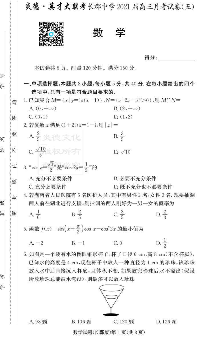 【數(shù)學(xué)】炎德英才大聯(lián)考2021屆長郡中學(xué)高三5次月考