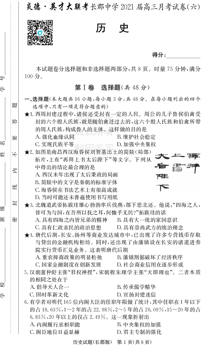 2026長郡中學新高考考前小題沖刺訓練·歷史