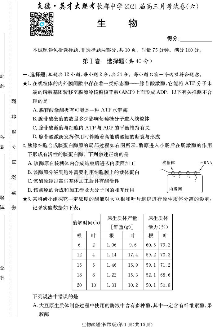 2026長郡中學新高考考前小題沖刺訓練·生物