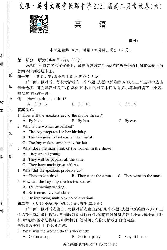 【英語(yǔ)】炎德英才大聯(lián)考2021屆長(zhǎng)郡中學(xué)高三6次月考