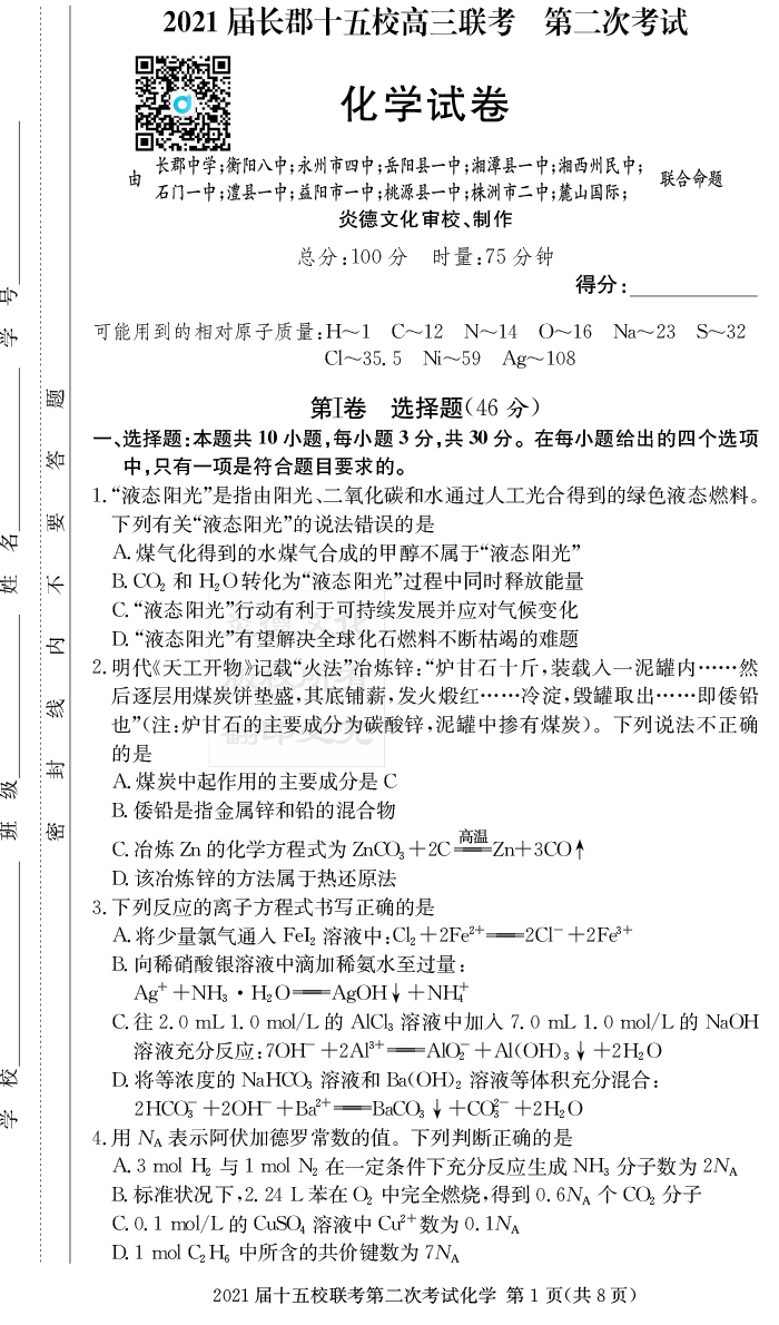 2026長郡中學新高考考前小題沖刺訓練·化學