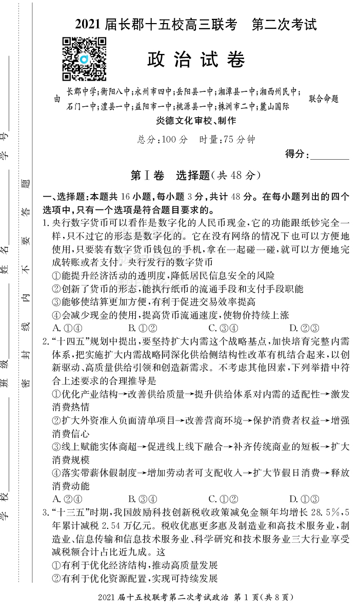 2026長郡中學新高考考前小題沖刺訓練·政治
