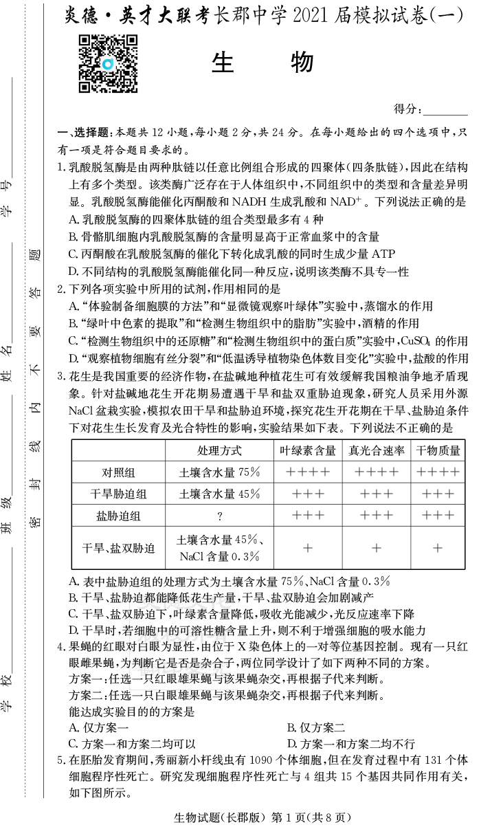 2026長郡中學新高考考前小題沖刺訓練·生物
