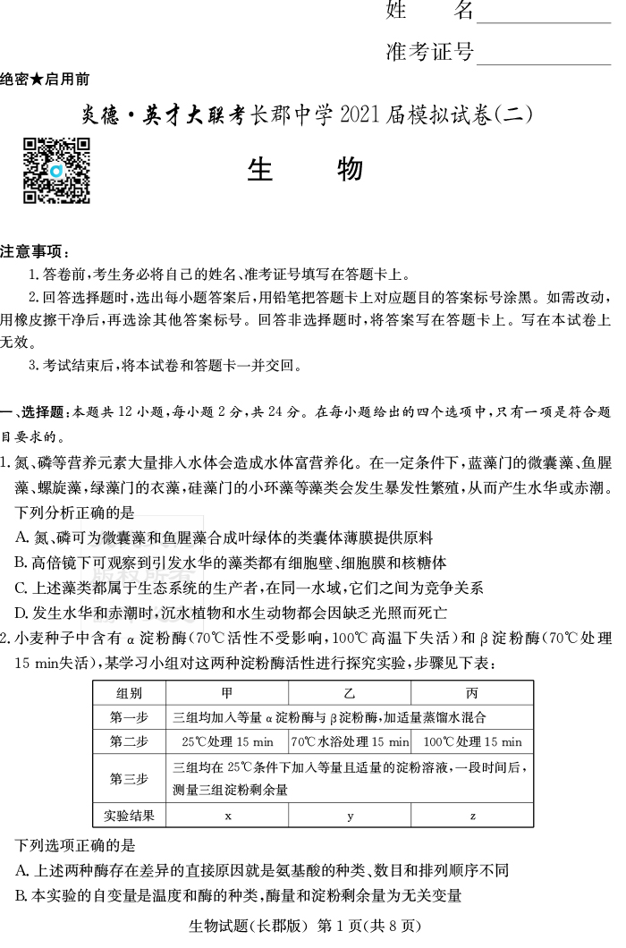 【生物】炎德英才大聯考2021屆長郡中學高三10次月考(模擬二)
