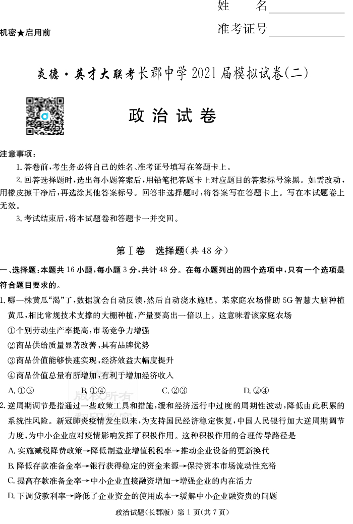 2026長郡中學新高考考前小題沖刺訓練·政治