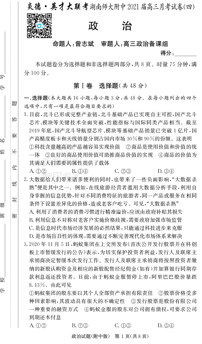 2026長郡中學新高考考前小題沖刺訓練·政治