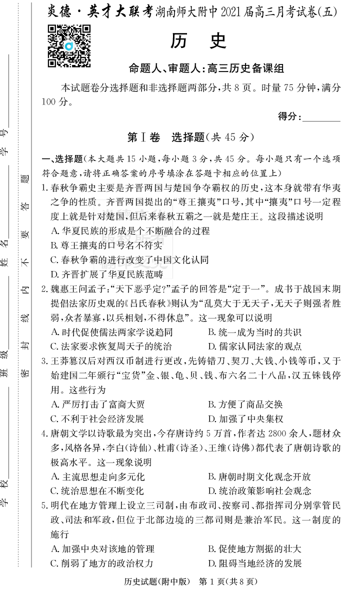 2026湖南師大附中新高考考前小題訓練·歷史
