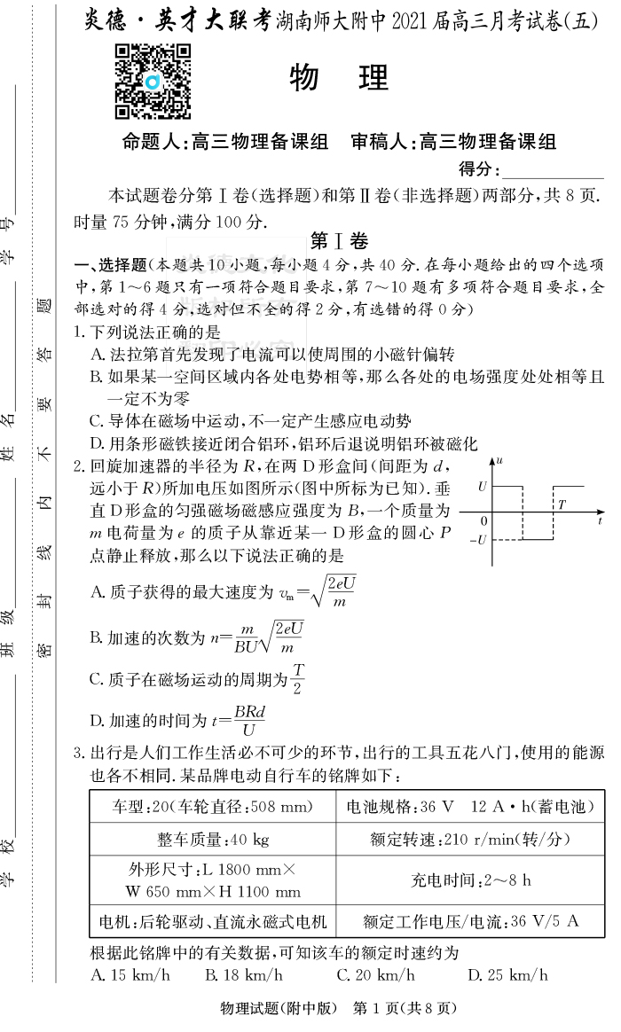 2026湖南師大附中新高考考前小題訓練·物理