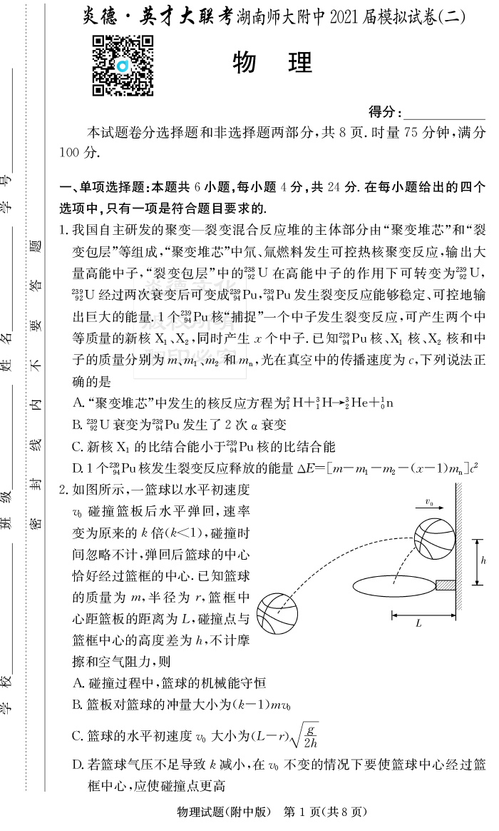 2026湖南師大附中新高考考前小題訓練·物理