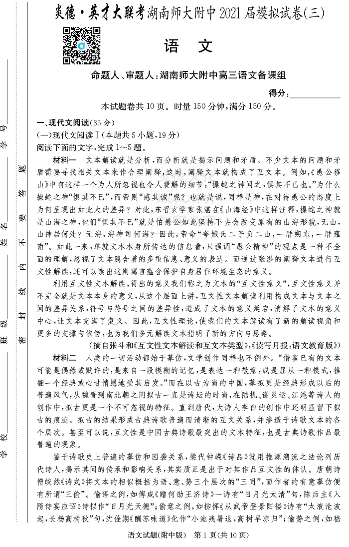 2026湖南師大附中新高考考前小題訓練·語文