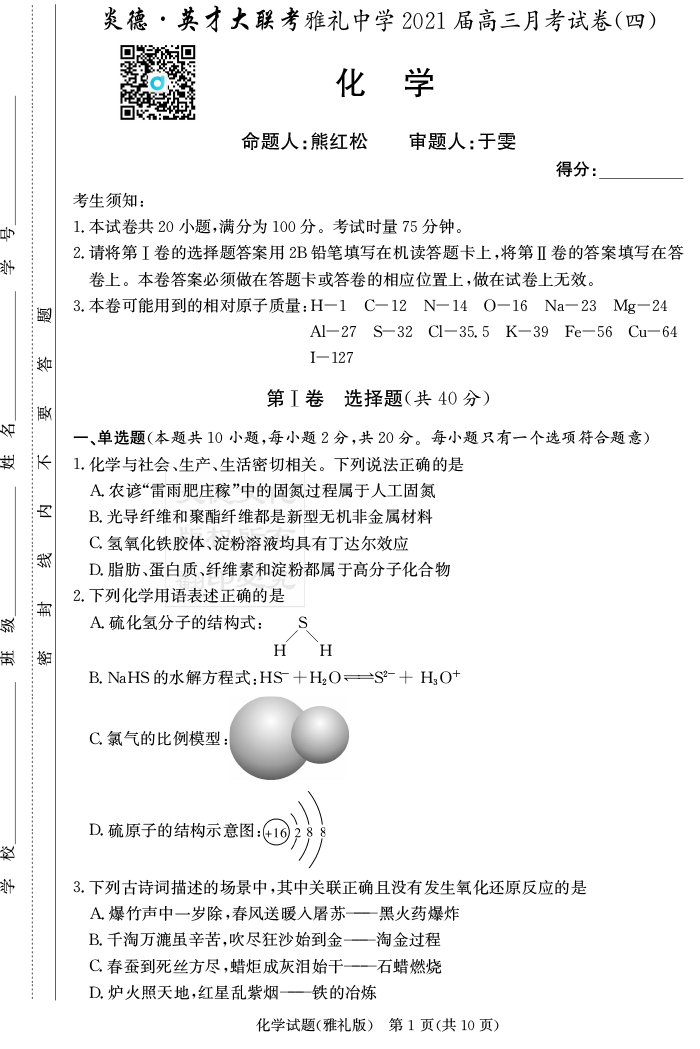 2026長郡中學新高考考前小題沖刺訓練·化學