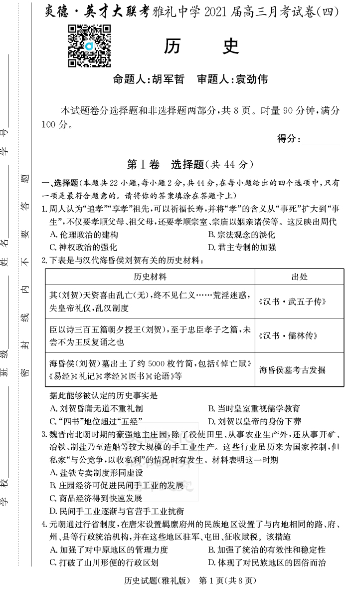 【歷史】炎德英才大聯考2021屆雅禮中學高三4次月考