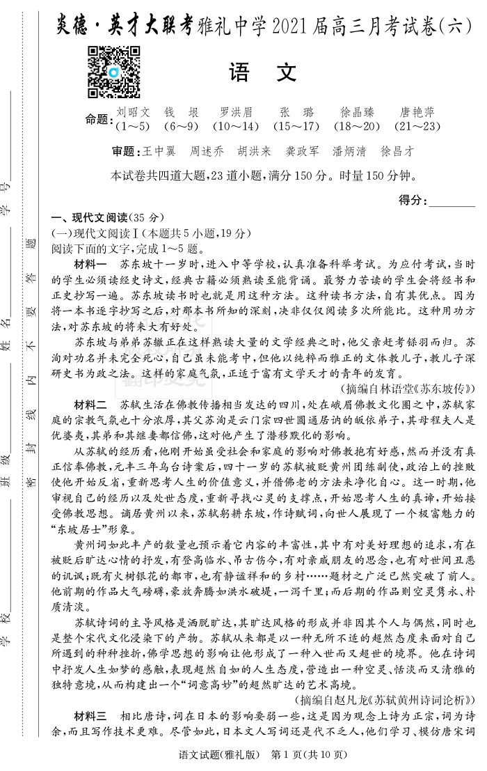 2026湖南師大附中新高考考前小題訓練·語文