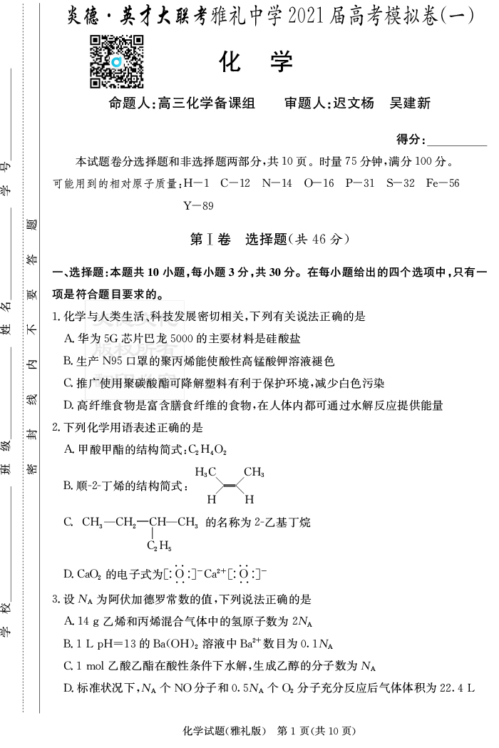2026長郡中學新高考考前小題沖刺訓練·化學