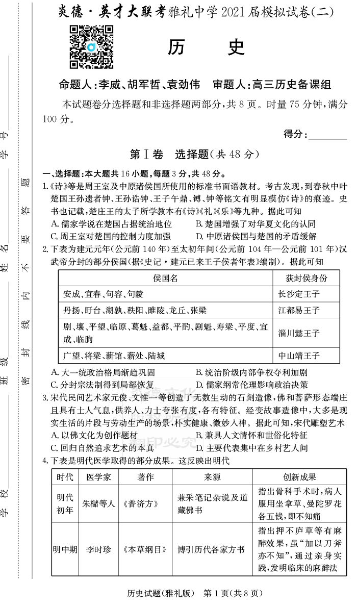 2026長郡中學新高考考前小題沖刺訓練·歷史