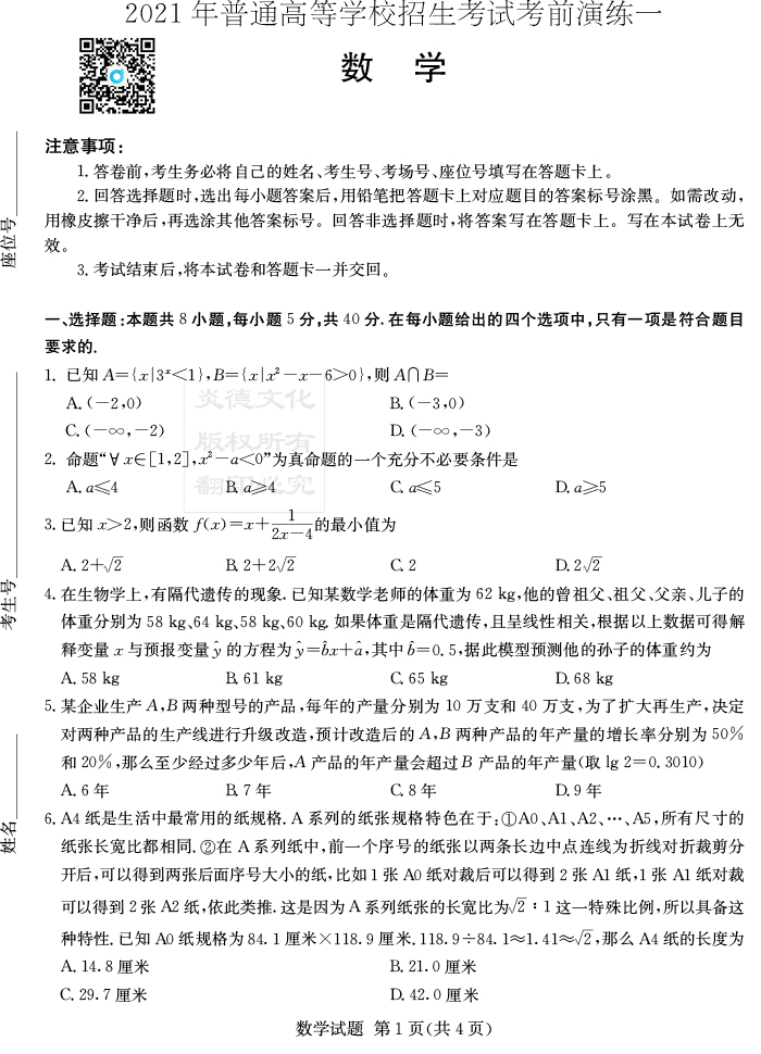 【數學】2021年普通高等學校招生全國統一考試考前演練(一)