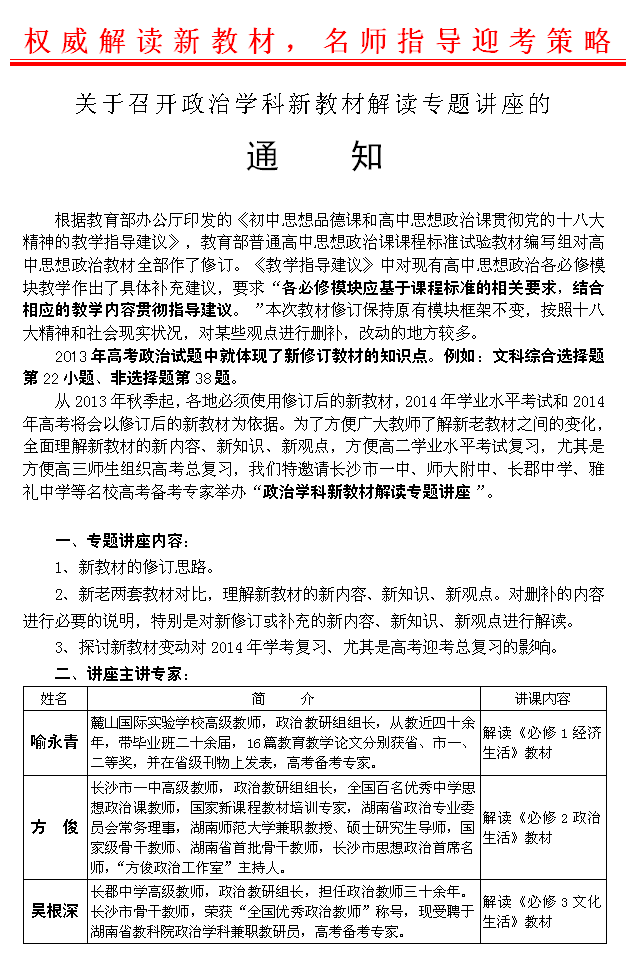 關(guān)于召開政治學(xué)科新教材解讀專題講座的通知(2013.09.08)