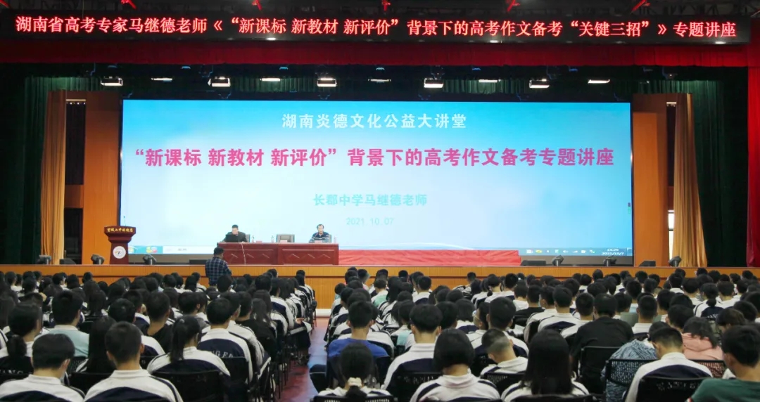 “乘騏驥以馳騁兮,來吾道夫先路。”金秋十月,大美校園,風送桂香,最是高三學子發奮時。2021年10月7日下午,望城二中攜手湖南炎德文化實業有限公司,舉辦主題為“新高考背景下高考命題特點及沖刺策略(語文學科)”的教育服務公益活動。高三年級全體班主任、語文教師及學生齊聚俊德樓三樓報告廳,在特邀專家馬繼德老師的引領下,探尋高考作文備考之路。