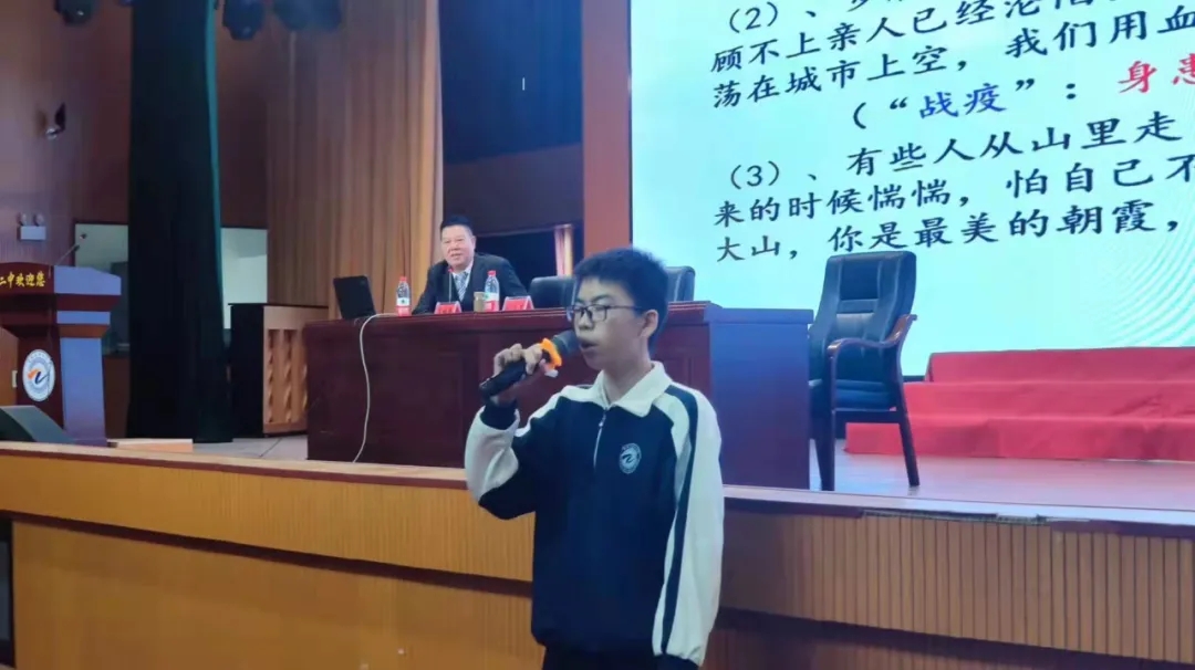 講座伊始,主持人劉滿和副校長向全體師生介紹了本次講座的主講人馬繼德老師:馬繼德老師是長郡中學特聘高中語文研究員,長郡中學清北班培訓專家,組大組長,省、市高級教師評審專家庫評委。1994年、1997年先后被市級、省級職稱評審委員會破格晉升為中學一級、中學高級語文教師,是長沙市2010年首批晉升的中學五級教師。曾獲創新杯及葉圣陶杯全國一等獎優秀指導教師、市級教學比武一等獎、市級十佳教師、縣級勞動模范等榮譽,是全國及省中語會授予的作文教學優秀教師。在省級、國家級報刊上公開發表論文數十篇,有省級一等獎結題課題,撰寫高考輔導書籍二百萬余字。近幾年在安徽、江西、湖南、廣東、廣西、湖北等省市縣完成高考備考講座百余場,應邀在懷化、婁底、郴州、岳陽、常德、邵陽、永州、湘西、長沙、玉林、柳州、池州、荊州、赤壁、武漢、湖南師范大學等地完成市級、省級教師培訓或高三復習研討會講座30余場。每一種卓越身份,每一項高光榮譽,每一個沉甸甸的成就,都昭示著這場講座的含金量。在熱烈的掌聲中,身著正裝、神采飛揚、風度翩翩的馬老師開始為時兩個小時的講座。