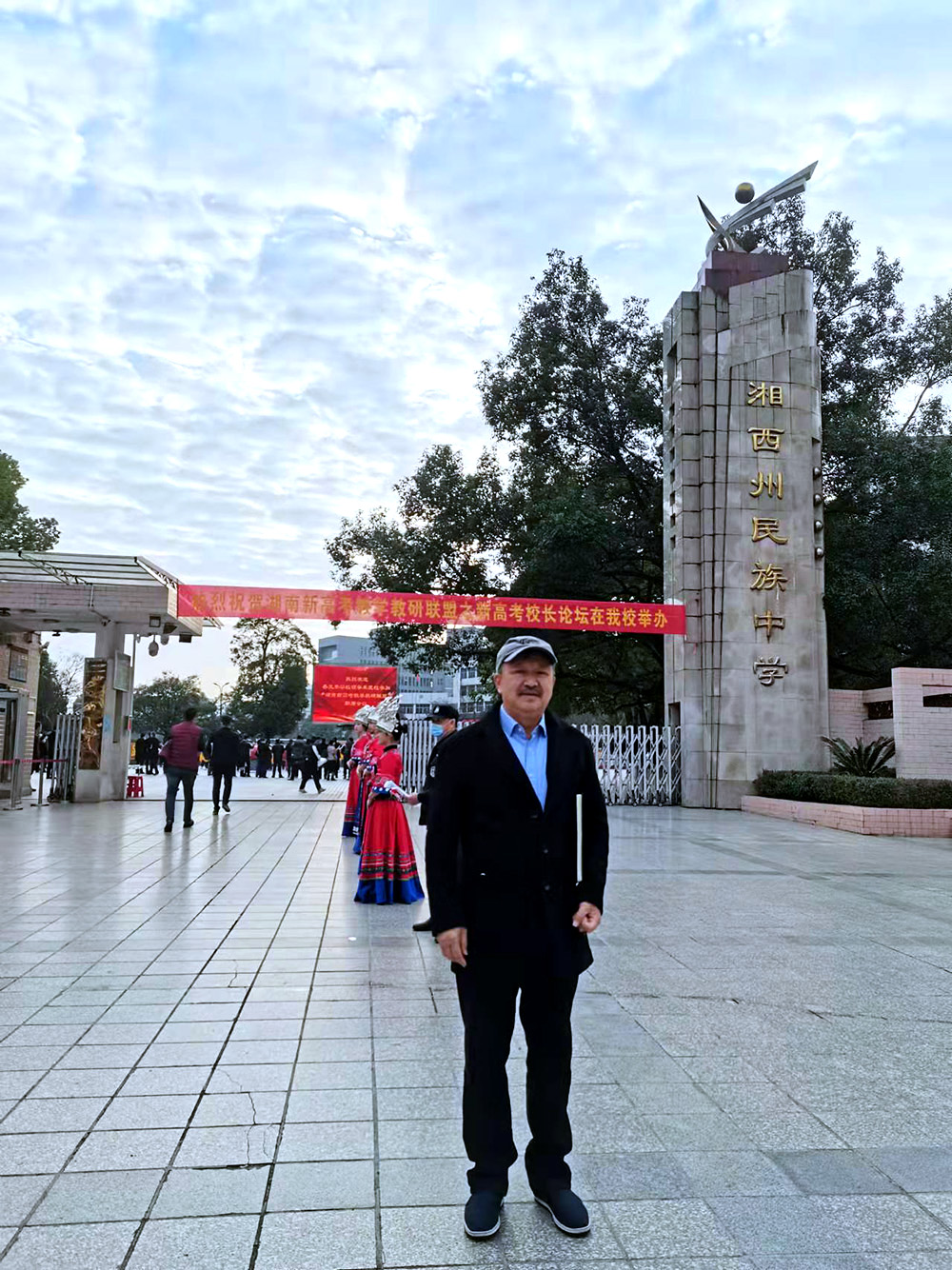 炎德文化董事長何譽軍先生在湘西州民族中學校門前留影