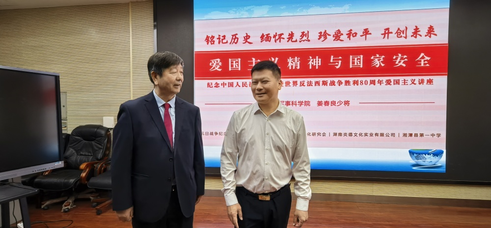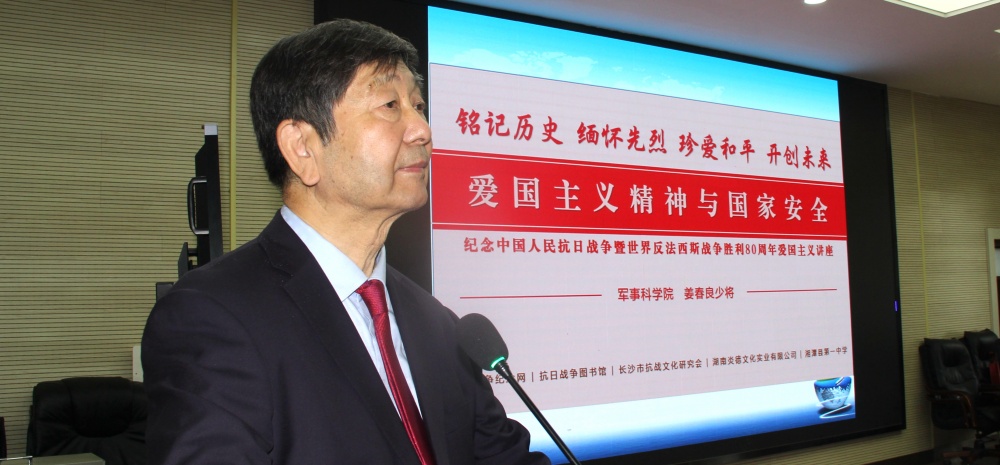 為紀(jì)念中國人民抗日戰(zhàn)爭暨世界反法西斯戰(zhàn)爭勝利80周年,弘揚(yáng)偉大抗戰(zhàn)精神,深化青少年愛國主義教育,湖南炎德文化實(shí)業(yè)有限公司、抗日戰(zhàn)爭紀(jì)念網(wǎng)、抗日戰(zhàn)爭圖書館、長沙市抗戰(zhàn)文化研究會(huì)決定聯(lián)合主辦“銘記歷史 緬懷先烈 珍愛和平 開創(chuàng)未來”愛國主義教育講座,邀請(qǐng)中國人民解放軍軍事科學(xué)研究院研究員姜春良少將主講《愛國主義和國家安全》。