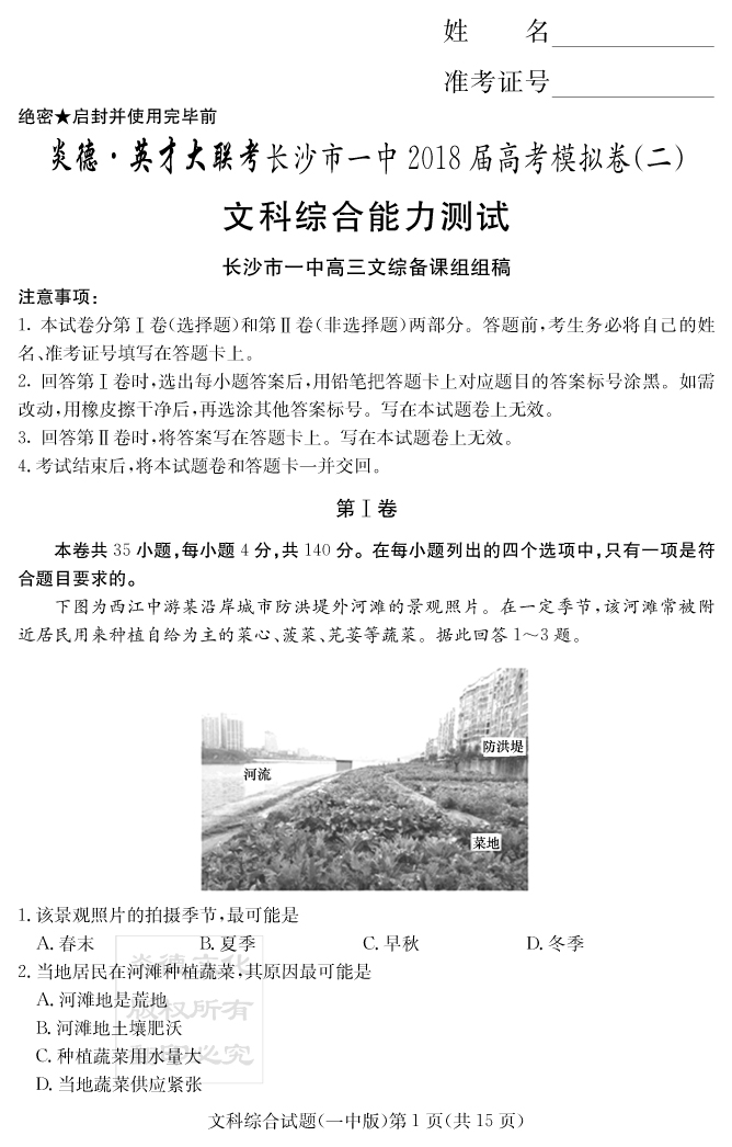 【文綜】炎德英才大聯考2018長沙一中高三11次月考(模擬二)